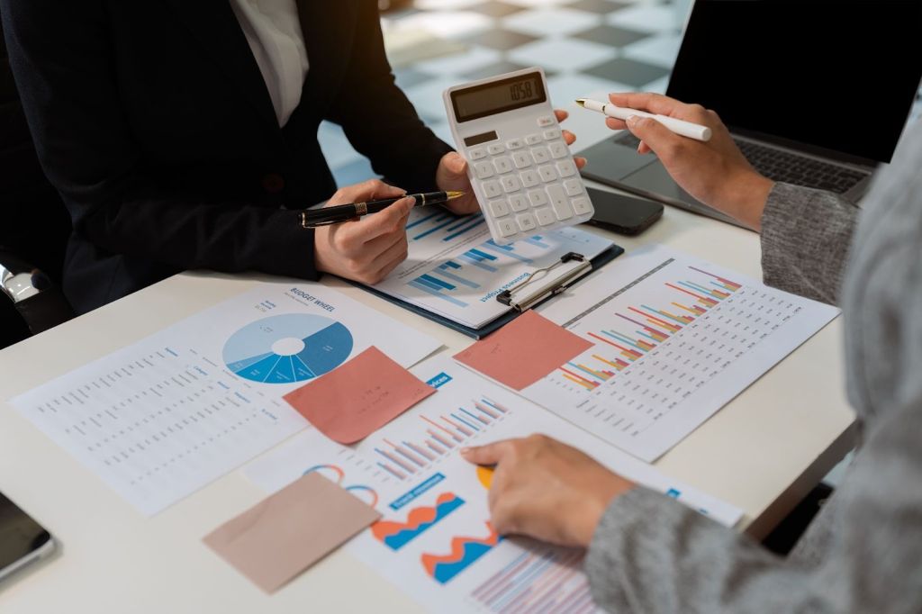 Two accounting professionals review company finances with a calculator and a chart